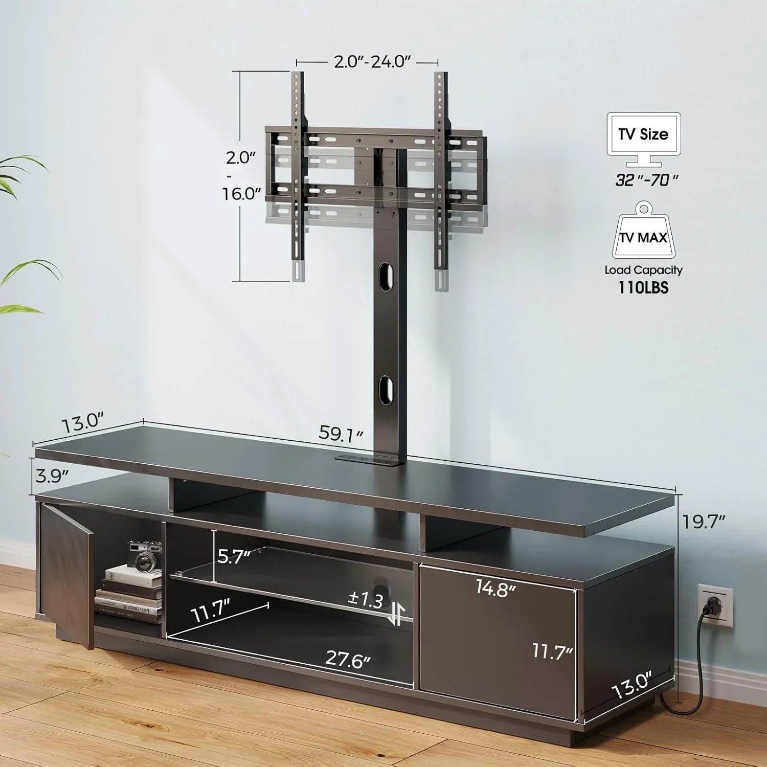 Swivel & Height Adjustment TV Mount: Swivel TV stand mount comes with an awesome swivel and height adjustment feature. You can watch TV from any angle with a each 34 degree swivel angle that will make moving your TV a breeze. 2 levels height adjust options make total height change from 53"-56" off the floorSuitable for Different Size TVs: This TV stand mount is suitable for Between 30 and 70 sizes TVs, this TV stand will be the perfect decoration for all kinds of places such as living room, bedroom, office, and study. This makes it the perfect choice for modern homesTV Stand with Charging Station and Wire Management: This entertainment center with power outlets built-in 4 standard plug outlets, so it can meet the needs of different equipment, which is convenient to charge your TV, DVD, WiFi router, and etc. The TV mount offer wire management to keep your cords from getting tangled and make it easy to plug in all of your devicesStrip LED Lights: The TV entertainment center with RGB LED lights for a contemporary look that will fit right in with any true gamer’s space. It features 7 main colors and 21 dynamic modes (flash, storage, fade, smooth). You can change the lights to suit your mood from the comfort of your couch with the included remote control